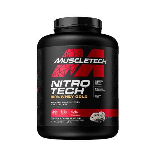 For over 20 years, Nitro Tech has been a leading protein brand. Built on a foundation of human research and cutting-edge science, it's earned the trust of countless consumers worldwide. Now the same research and development team has pioneered a new formula based on superior protein sources, quality and manufacturing. Introducing Nitro Tech 100% Whey Gold, a pure protein formula featuring whey peptides and isolate!Hydrolyzed whey peptides are the fastest-absorbing protein micro-fractions on the planet, which is why they are a significant part of our formula! Along with micro-filtered whey protein isolate plus whey concentrate, Nitro Tech 100% Whey Gold delivers superior absorption, digestibility and mixability. Each scoop serves up 24g of ultra-premium protein that supplies 5.5g of BCAAs and 4g of glutamine and precursor. Nitro Tech 100% Whey Gold uses a superior cold microfiltration process to guarantee a higher quality whey protein. Combined with an award-winning flavour profile, Nitro Tech 100% Whey Gold is as good for your taste buds as it is for your muscles.Container Size: 2270 gServing Size: 1 Scoop (33 g)Servings Per Container: Approx. 77Nutrition value Per ServingEnergy: 120 kcal from Fat: 20 kcalFat: 2 g of which Saturated: 1 gCholesterol: 65 mgCarbohydrate: 2 g of which Sugars: 2 gProtein: 24 gCalcium: 100 mgIron: 0.36 mgSodium: 120 mgIngredients Premium Protein Blend (Whey Peptides, Whey Protein Isolate, Whey Protein Isolate 97%), Whey Protein Concentrate, Natural and Artificial Flavour, Soy Lecithin, Gum Blend (Cellulose Gum, Xanthan Gum, Carrageenan, Dextrose), Salt, Silicon Dioxide, Sucralose, Acesulfame-Potassium.(based Vanilla Flavour)Recommended UseMix 1 scoop with 6 oz. of cold water or skim milk in a glass or shaker cup.Use between major meals and before and after exercise.AllergensContains Milk and Soy ingredients.Processed in a facility that also processes Peanut, Tree Nut, Egg, Fish/Crustacean/Shellfish Oil and Wheat products.