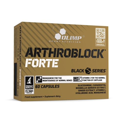 Olimp Arthroblock Forte food supplement. Arthroblock Forte is a dietary supplement containing ginger extract, Boswellia serrata extract and glucosamine. The product also contains vitamin C, which contributes to normal collagen formation for normal function of bones and cartilage, as well as manganese, which helps maintain normal bones and normal connective tissue formation.